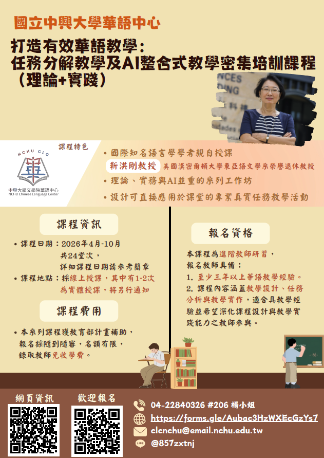 ※本資訊為轉知公告,如有課程相關問題,請洽國立中興大學華語中心。